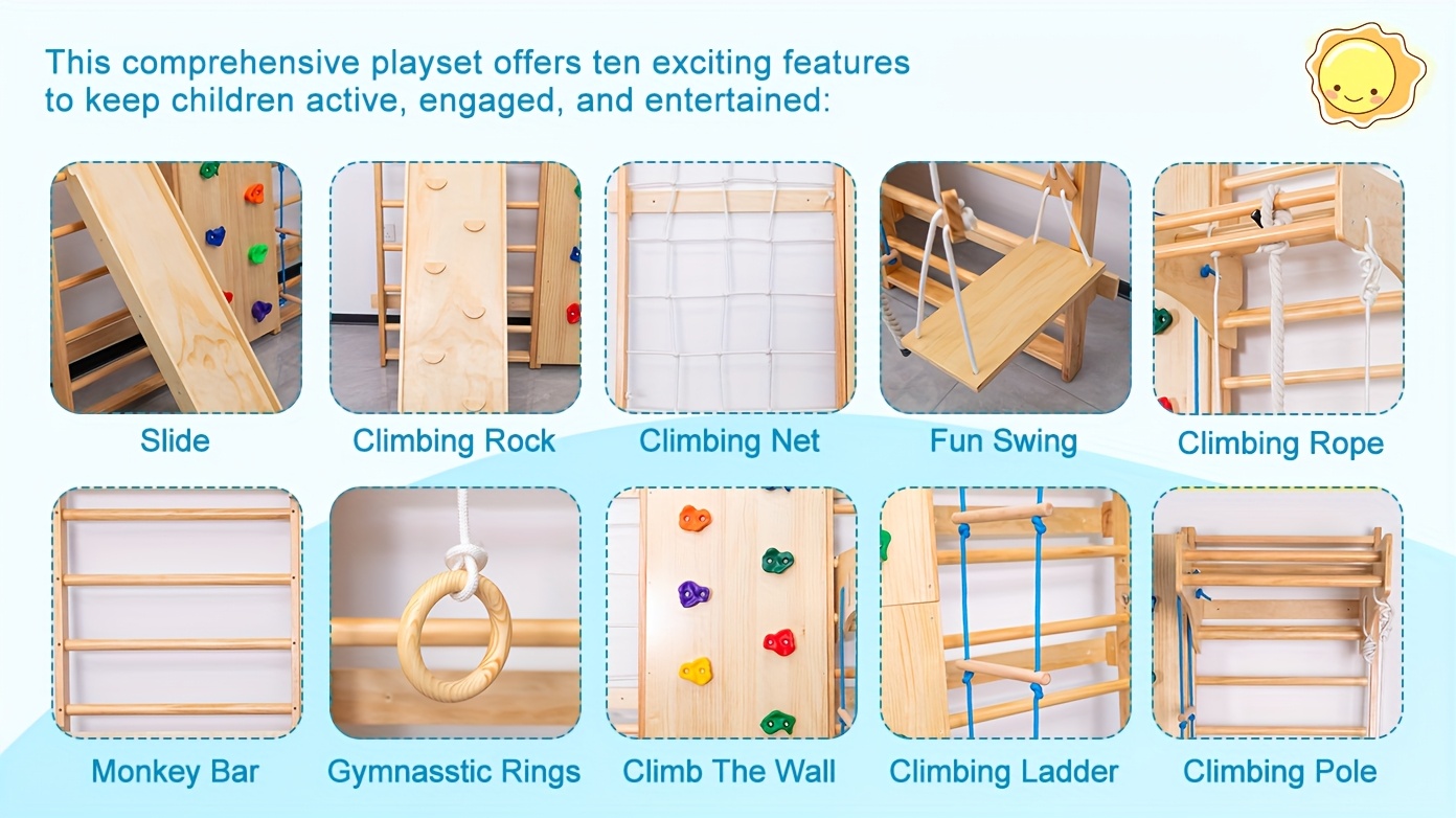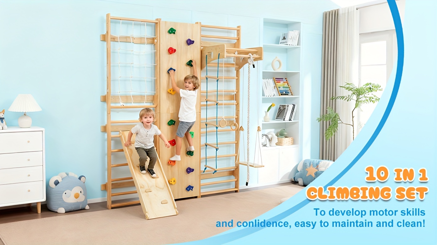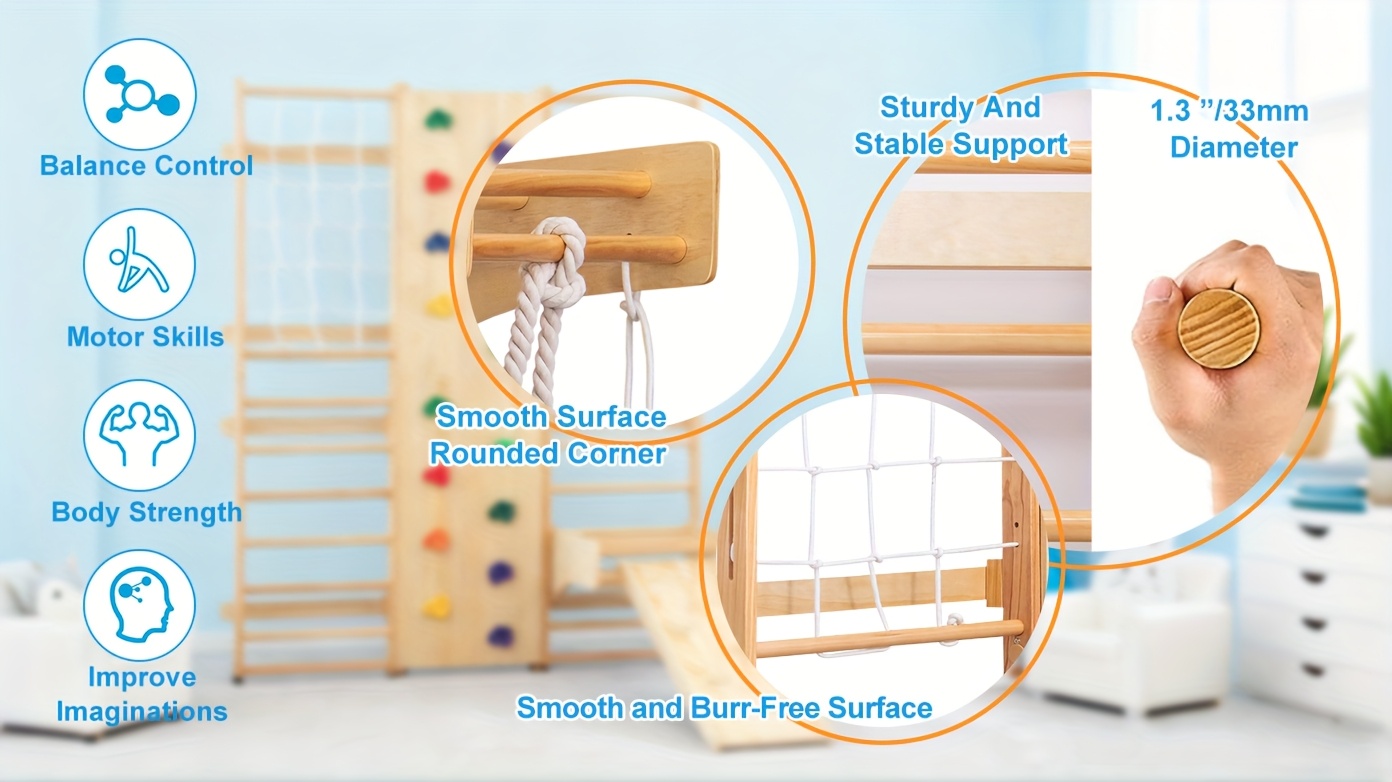 [Easy Assembly, Clever Space-Saving Design]Considering the practical needs of families, this climbing frame is designed with easy assembly and space utilization in mind. The assembly process is straightforward and quick, and all necessary installation accessories are included, allowing parents to easily complete the setup. The wall-mounted design not only saves valuable floor space but also allows the climbing frame to fit seamlessly into various indoor environments, whether it's a spacious livi