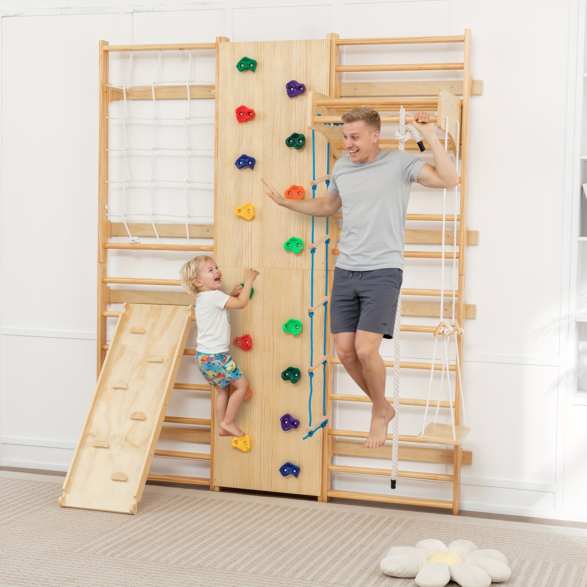10-in-1 Solid Wood Swedish Ladder Wall Gym - All-in-One Kids & Adult Climbing Frame with Rock Wall, Gymnastics Rings, Pull-Up Bars, Slide, Swing Set | Indoor/for home Playground Equipment, Easy Assembly, Space-Saving Multi- A