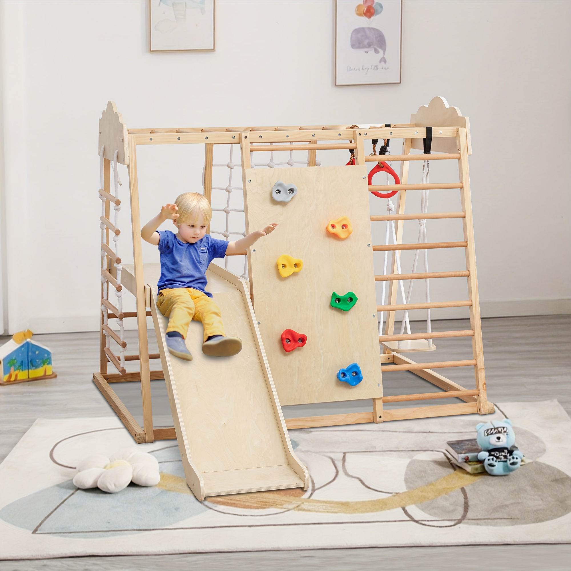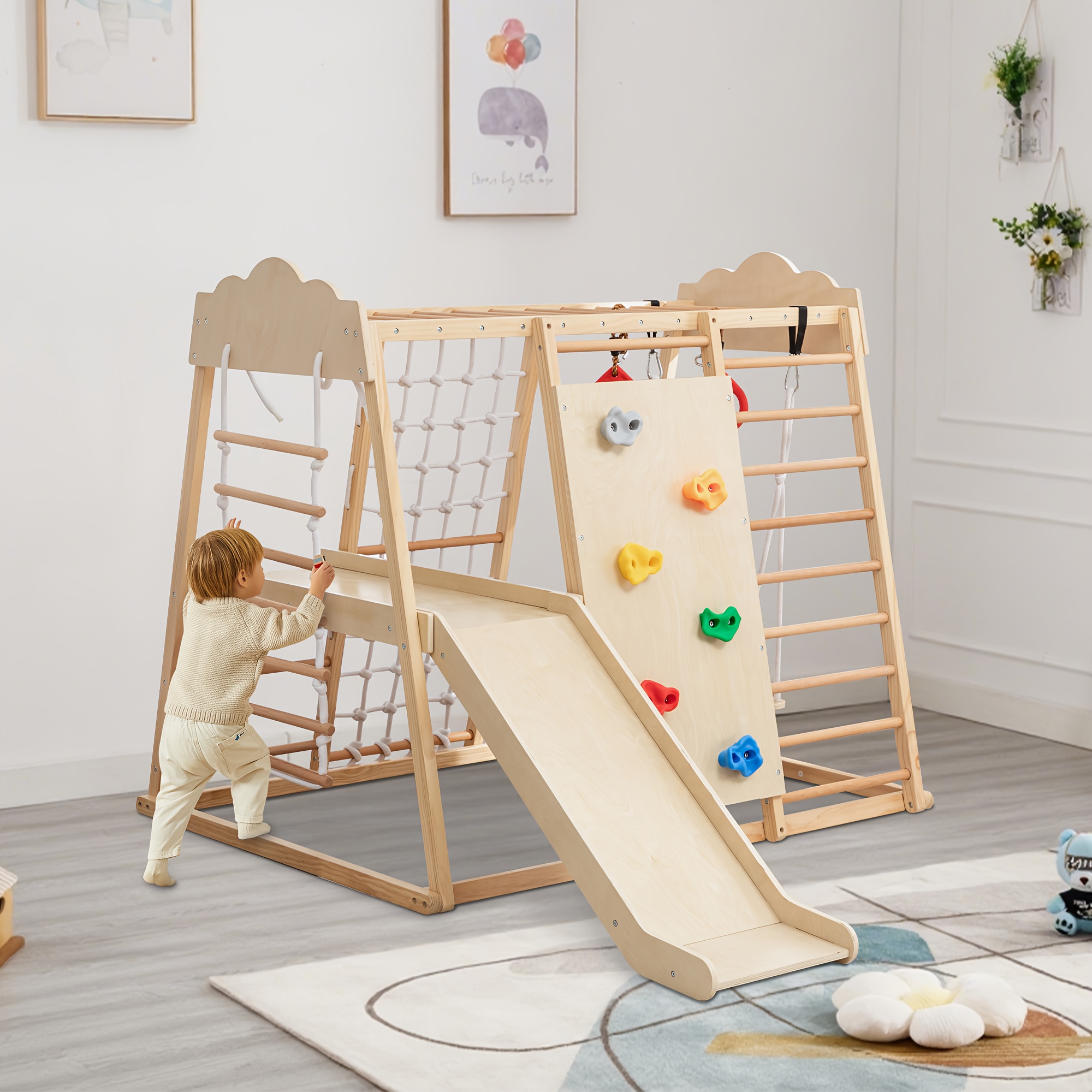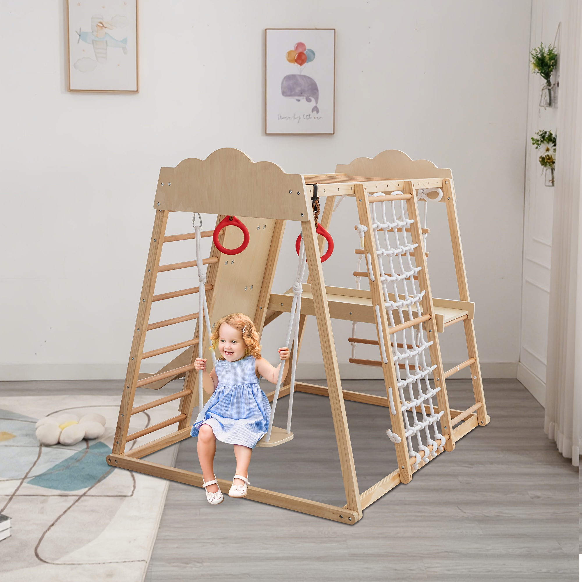 The 8-in-1 indoor jungle gym for toddlers includes a climbing wall, slide, monkey bars, ladder, gymnastic rings, climbing net, swing, and climbing ladder. It offers up to eight different activities for children to enjoy. This playset not only ensures fun for kids but also aids in the development and improvement of their motor skills.