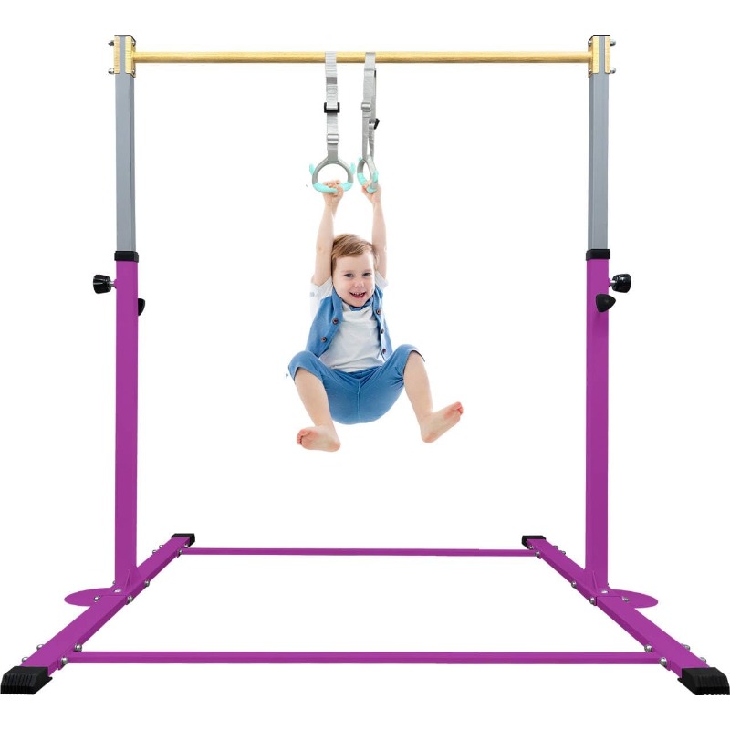 Adjustable Gymnastics Bar with Mat - Heavy-Duty Steel Frame & Foam Grip, 250 lbs Capacity, 3'-5' Height Adjustable Horizontal Kip Bar with Rings for Home Training, Easy Assembly with Tools Included, Ideal for Ages 3-15, Indoo